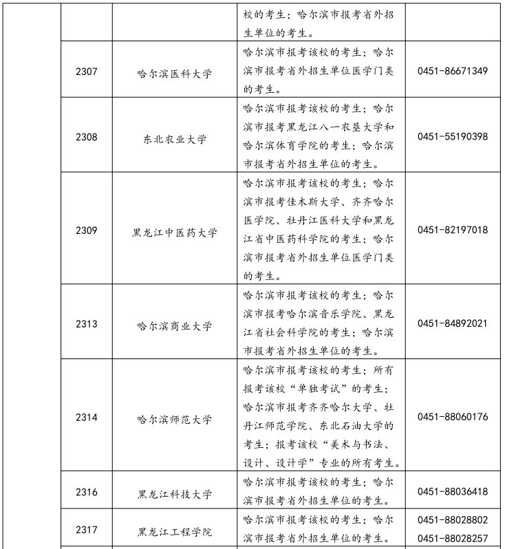3.哈爾濱市報(bào)考省外招生單位的考生須選擇黑龍江科技大學(xué)、黑龍江工程學(xué)院、哈爾濱學(xué)院、黑龍江東方學(xué)院、哈爾濱金融學(xué)院、哈爾濱理工大學(xué)、黑龍江大學(xué)、東北農(nóng)業(yè)大學(xué)、哈爾濱商業(yè)大學(xué)、哈爾濱醫(yī)科大學(xué)、黑龍江中醫(yī)藥大學(xué)這11個報(bào)考點(diǎn)報(bào)名。其中,哈爾濱醫(yī)科大學(xué)、黑龍江中醫(yī)藥大學(xué)僅受理報(bào)考省外招生單位醫(yī)學(xué)門類(考試科目不含“臨床醫(yī)學(xué)綜合能力”)的考生。