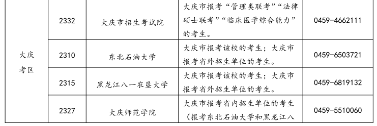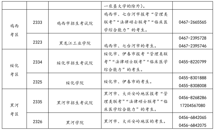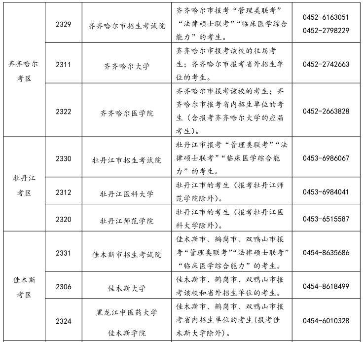 2.報(bào)考專業(yè)屬于“管理類聯(lián)考”和“法律碩士聯(lián)考”及考試科目含“臨床醫(yī)學(xué)綜合能力(西醫(yī))、臨床醫(yī)學(xué)綜合能力(中醫(yī))”的應(yīng)屆畢業(yè)生,應(yīng)選擇就讀學(xué)校所在地報(bào)考點(diǎn);往屆考生須選擇戶籍或工作所在地的哈爾濱市招生考試院、齊齊哈爾市招生考試院、牡丹江市招生考試院、佳木斯市招生考試院、大慶市招生考試院、雞西市招生考試院、綏化市招生考試院、黑河市招生考試院上述八個報(bào)考點(diǎn)之一。